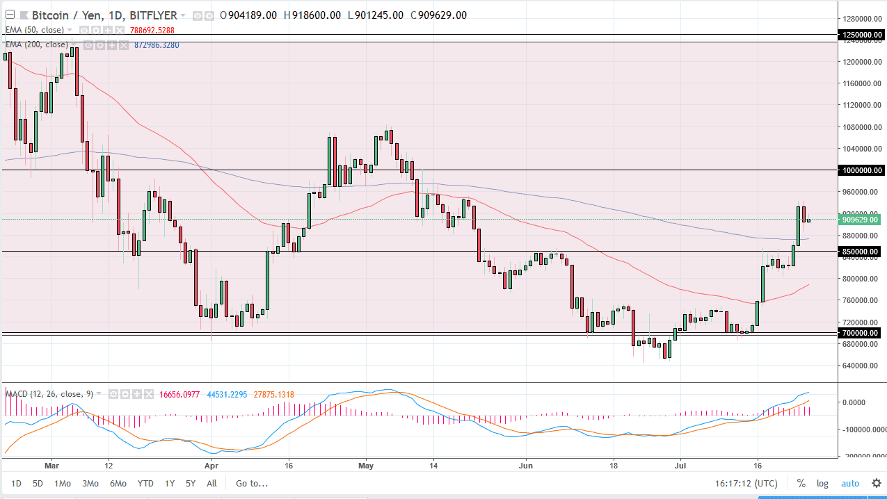 Bitcoin markets have attempted to rally during the trading session on Thursday but gave back much of the gains as it looks like we are ready to pull back a bit. This makes sense, the market had gotten ahead of themselves, and I think that pullbacks offer value the people are looking for. After all, it would be a difficult proposition to expect a lot of people to jump in $2000 later. I think this pullback should see plenty of interest somewhere near the $7500 level, but if we were to break down below the $7250 level, the market will probably unwind and fall towards the lows again. While I don’t advocate selling right now, I do think that at the very least we are looking at a pullback. The market has gone parabolic over the last several days, so this of course is normal.