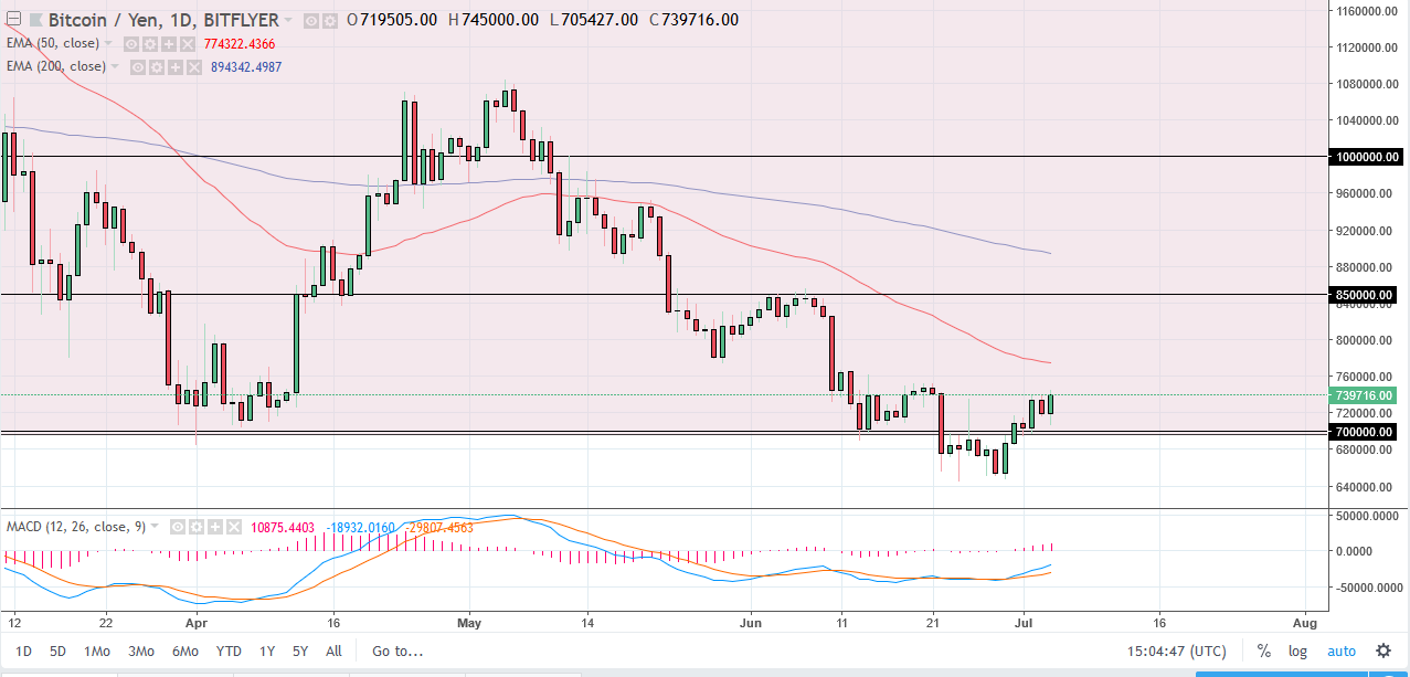 Bitcoin also rallied against the Japanese yen as you would expect, but still remains below the important ¥750,000 level, and of course the 50 day EMA. If we can clear the 50 day EMA, it’s possible that we may go looking towards the ¥800,000 level, and then possibly beyond that to the ¥850,000 level. I believe that if you are patient enough, you should have plenty of opportunities to short this market, based upon the first signs of exhaustion. I believe that the market continues to be very negative overall, so I think that it’s only a matter time before we get involved to the downside, and therefore I’m going to be very patient during this bounce. It’s not until we clear the ¥850,000 level that I am truly impressed with the ability for the market to go higher.