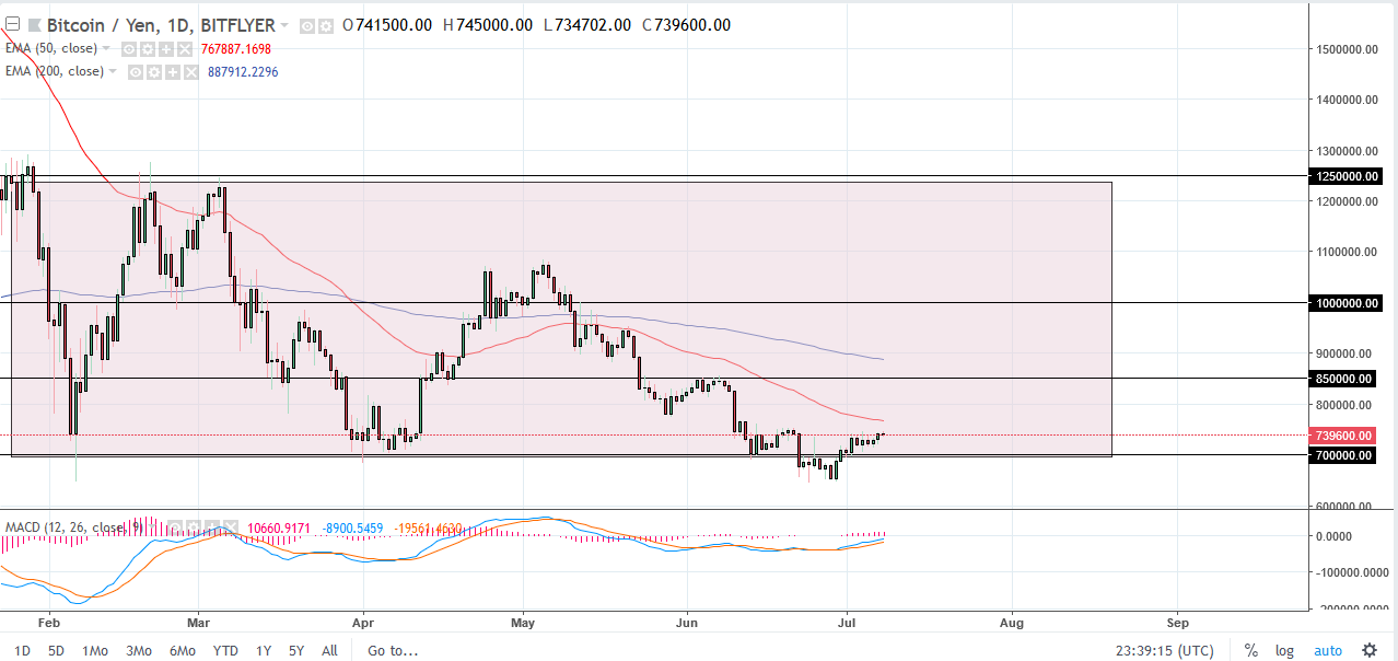 Bitcoin has done very little against the Japanese yen at the open on Monday as well, with the 50 day EMA just above offering resistance, and it’s likely that we will probably see a bit of selling in the short term. However, if we were to break above the 775,000 young level, we could then go to the ¥850,000 level. Otherwise, we will continue to bounce around and consolidate around the ¥700,000 level, an area that has been important more than once. I don’t see anything that tells me the market has anything going for it other than a short-term bounce, so at this point I suspect that the sellers will return at the first signs of trouble. That being said, if we were to somehow break above the ¥850,000 level, then I think ¥1 million would be the next target. Otherwise, I expect to see exhaustion sold..