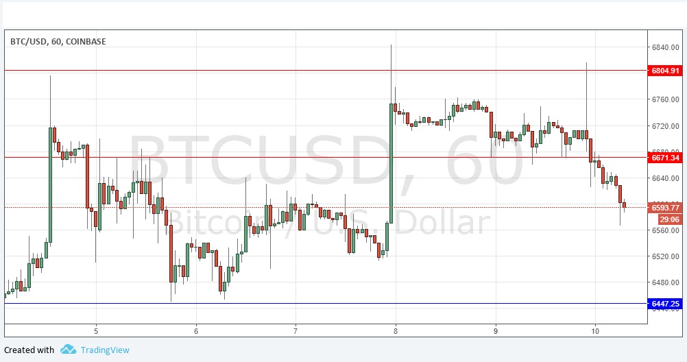 I wrote yesterday that if the price could break above the resistance at $6,850 then it had room to rise all the way to the psychological level of $7,500 without encountering any obvious obstructions. I had a bullish bias today provided the price remains above $6,671. This worked out well, as did the support and resistance levels, which held almost perfectly with accompanying obvious price action to confirm the turns. Bitcoin has been respecting its technical support and resistance levels, and it has tended to do this over recent months, making it quite attractive to technical traders. However, the strong trends and massive price movements may be a thing of the past, at least for a while, and the break we have seen now of support suggests that the price is most likely to move down to the area around $6,500. I have a bearish bias today.