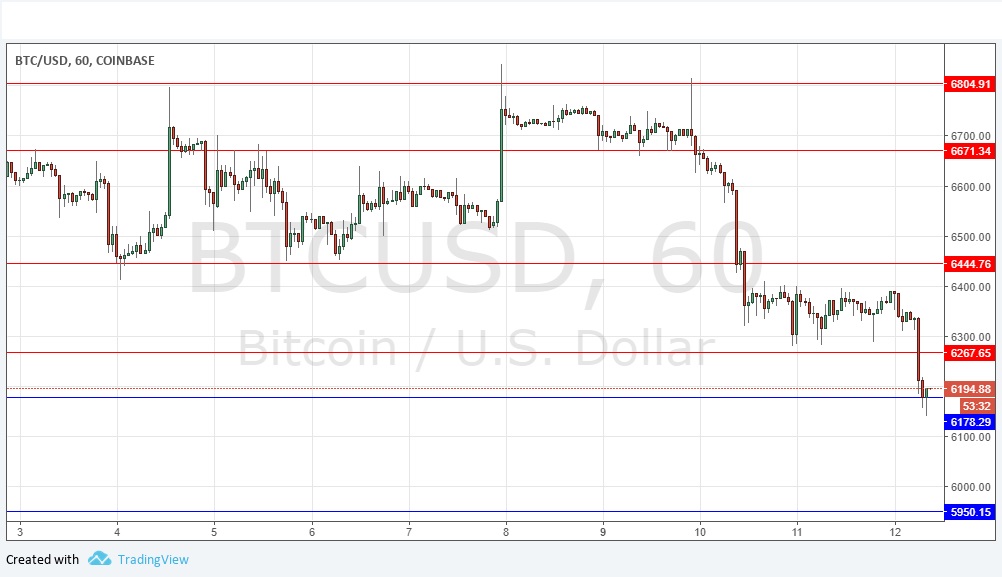 I wrote yesterday that I thought it was very unlikely that the price would be able to get above the resistance level at $6,445 today, and I was completely correct, with the price finally breaking down again below support and falling further. The price is now finding support at $6,178, but the picture looks very bearish and I have a bearish bias, although as the price is bouncing it may well rise over the next few hours. I think it is more likely that the support will be broken over the next 24 hours than that it will hold.
