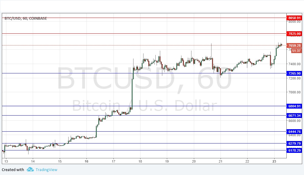 I wrote last Thursday that I was bullish above $7,266. Although the price moved down a little that day, the level has continued to hold since then, and the price has continued to move up, invalidating another resistance level a short while ago. There is every reason to stay bullish as the price keeps on moving up, erasing resistance, and forming higher support. The further above the key psychological level of $7,500 the price gets, the more bullish I will be over the short-term. I have a bullish bias today.