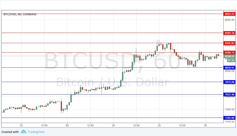 Yesterday’s signals could have been used to take a long trade from the gentle, slow, bullish bounce at $8,051. However, the short trade from $8,436 was much better and more profitable. It would probably be a wide idea to exit any open trade now.