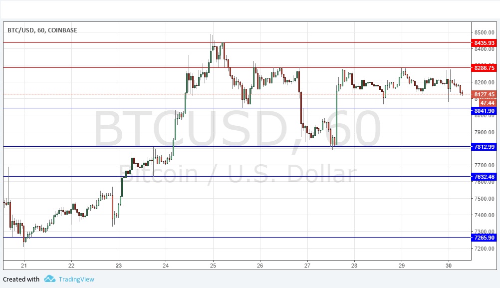 I wrote last Thursday that we were likely to see the support level of $8,051 hold up, so a bullish bounce there was likely to be a good trade. I also said that I still saw a bullish picture, but the rise was likely to continue to slow down and begin a period of consolidation. I was right on this last part, but wrong about $8,051 holding as support. After the price broke down to lower support, it turned around and rose again, but the pace of the rise has now slowed to nothing and we are established within a consolidation between $8,287 and $8,042. How the price reacts at either or both these levels should determine what will happen today. I would take a bearish bias if the price can get established below $8,000 but otherwise I take no directional bias.