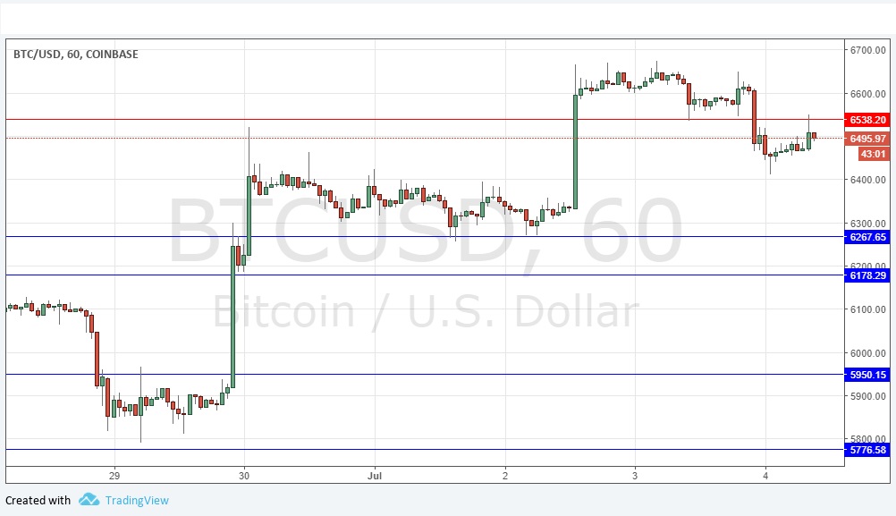 I wrote yesterday that if the former resistance at $6,563 held for a while, we were likely to see another upwards push, so I took a mildly bullish bias. This did not work out so well as the level did not hold up and the price moved down, but I was right to see that level as pivotal. I have adjusted it slightly, but it should now act as resistance. Despite the new lower resistance, the action still looks relatively bullish, but I have no directional bias today. The price needs more time and more bullish action before it can become possible to be more confidently bullish.