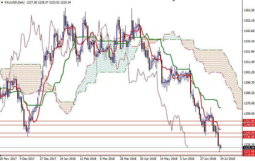 The bears have the overall technical advantage, with the market trading below the daily and the 4-hourly Ichimoku clouds. The Tenkan-Sen (nine-period moving average, red line) and the Kijun-Sen (twenty six-period moving average, green line) are negatively aligned. The bulls will need to lift prices above 1230 to challenge the next barrier standing in the 1236-1234.50 area. If the market overcomes this hurdle, we may see a push up to 1242/0.