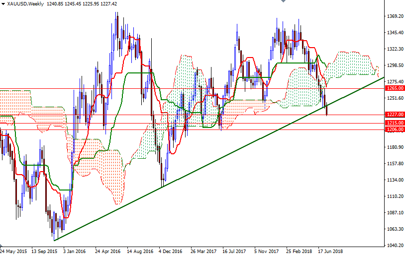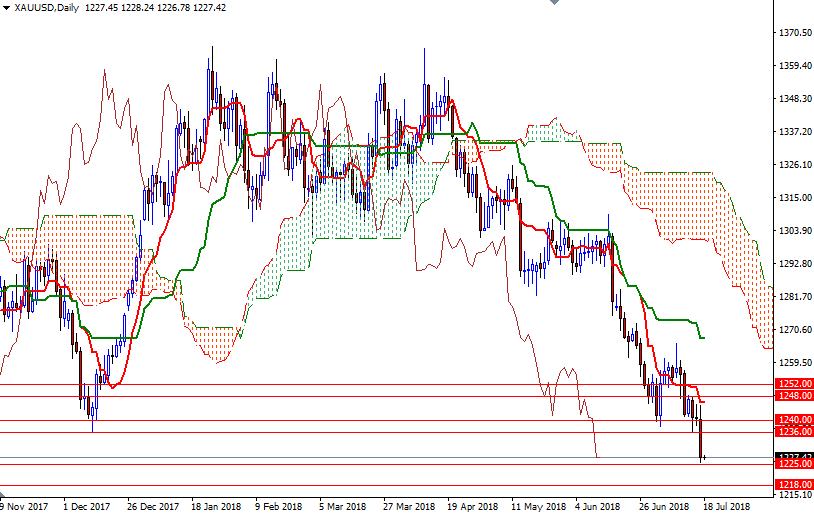 XAU/USD is trading below the daily and the 4-hourly charts, and the Tenkan-Sen (nine-period moving average, red line) and the Kijun-Sen (twenty six-period moving average, green line) are negatively aligned. The Chikou-span (closing price plotted 26 periods behind, brown line) also confirms that the bears now have technical momentum on their side. A strong U.S. dollar index and a deteriorating technical posture will continue to inspire chart-based sellers.