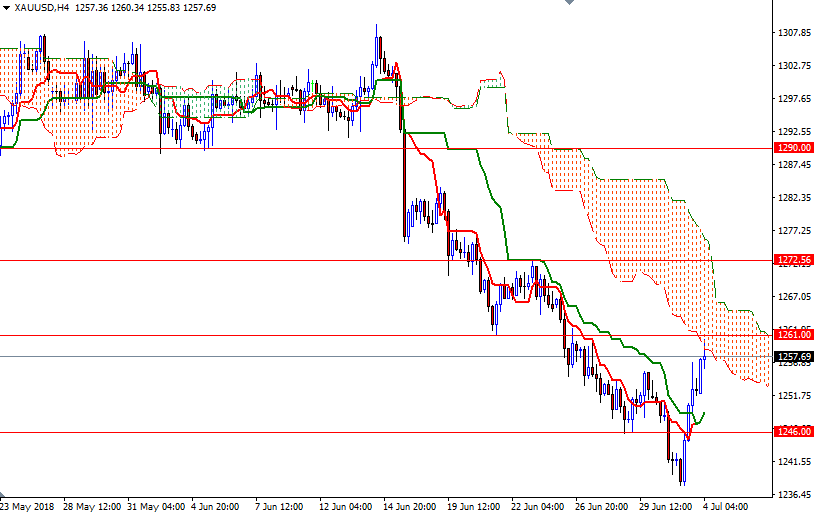 The short-term charts are slightly bullish at the moment, with the market trading above the Ichimoku clouds on the M30 and H1 time frames; plus, we have positively aligned Tenkan-Sen (nine-period moving average, red line) and Kijun-Sen (twenty six-period moving average, green line). However, keep in mind that a three-month-old downtrend is in place on the daily chart. The 4-hourly Ichimoku cloud is sitting right on top of us so the bulls will have to break through 1259.40-1262 if they intend to challenge 1266/5. A break above 1266 implies that XAU/USD is heading up to 1272.56-1270.