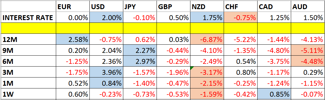 Let’s take a look at the relevant data of currency price changes and interest rates to date, which we compiled using a trade-weighted index of the major global currencies:
