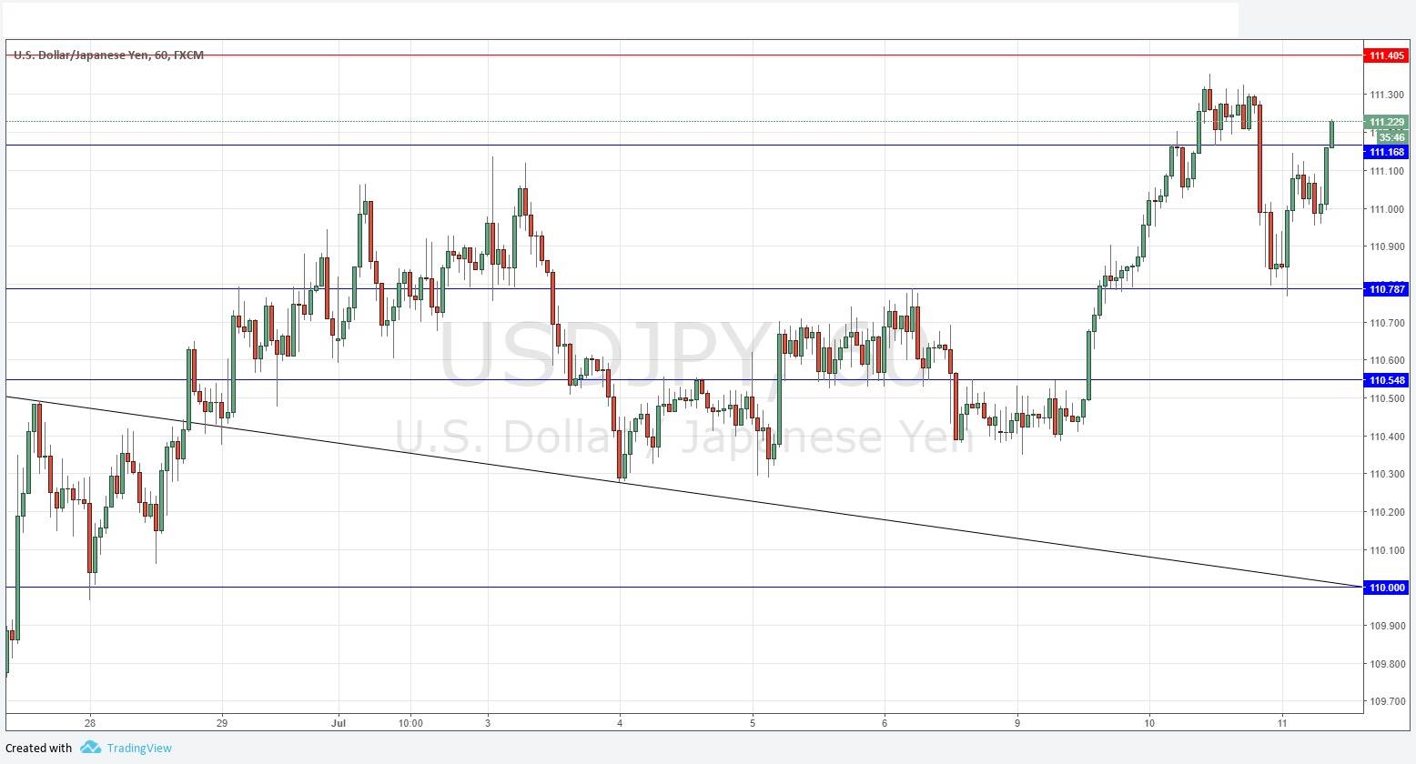 I wrote yesterday that I had a bullish bias. In fact, the price consolidated above the nearby support before breaking down suddenly just before the Asian session on news that the U.S. was threatening more tariffs on Chinese imports. The price recovered quickly however, bouncing reliably at the support, and in recent minutes as at the time of writing seems to be breaking above the resistance level at 111.17, which might now become support, although it is too recent to be reliable. Considering the recent strongly bullish move to new highs, and the weak but real long-term bullish trend, I take a bullish bias today and think we are likely to see new highs after the New York open later.