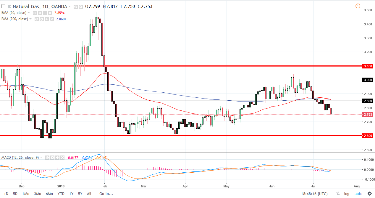 Natural gas markets initially tried to rally during the day on Friday but gave back 1.75% of value again. The market looks as if it is ready to break down below the $2.75 level, and perhaps drift down to the $2.70 level next, followed by the $2.60 level. This is a market that continues to see a lot of volatility, but at the end of the day we continue to see an oversupply of natural gas and of course a relatively strong US dollar. Both of these are working against the value of this market, and I think that it’s likely we will continue to see a bearish pressure. Beyond that, Piedmont Natural Gas announced during the trading session that they were going to build a huge storage project in North Carolina, which of course will add to oversupply.
