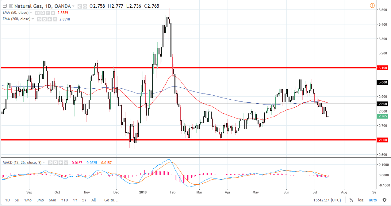 The natural gas markets did very little during the day, bouncing around the $2.75 level. I think that the market has a significant amount of support underneath, so don’t be surprised if we get a bit of a bounce. The $2.85 level above is significant resistance, as it was previous support. The 50 day EMA just crossed below the 200 day EMA and is a longer-term sign of negativity. I think selling rallies continues to be the way forward, as we should go to the $2.60 level underneath, an area that has offered a significant amount of demand, and I don’t think that is going to change, meaning that we have a bit of a “floor” in place. I continue to short rallies.