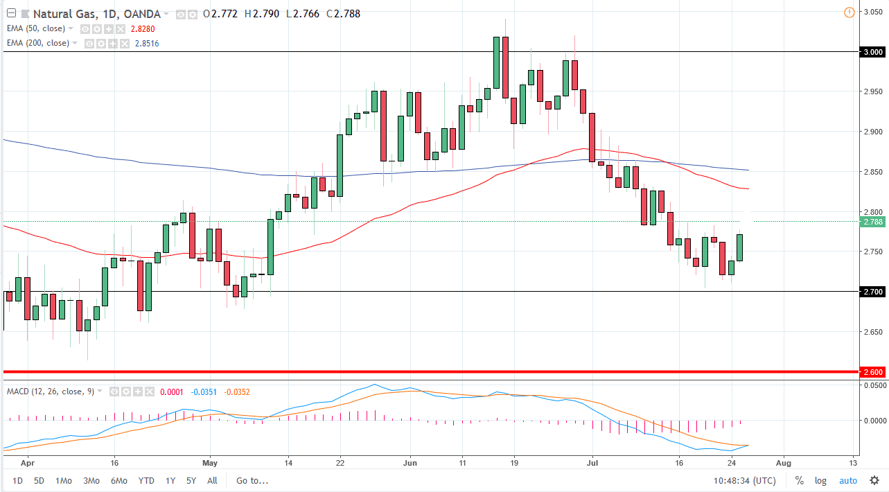 Natural gas markets rallied a bit during the trading session, testing the $2.78 level for resistance. We did pull back a little bit from there, and it looks as if we continue to go back and forth, perhaps consolidating above the $2.70 level. On a break down below the $2.70, it’s likely that the market could continue to drift towards the $2.60 level, which is the bottom of the overall consolidation. I think at this point though, if we do rally from here, it’s an opportunity to start selling again on signs of exhaustion. I believe natural gas will continue the overall negativity, and I see plenty of resistance at the $2.80 level, the $2.85 level, and the $2.90 level. In other words, I see far too many problems above to start buying, and I believe that rallies are simply to be sold at the first signs of trouble.
