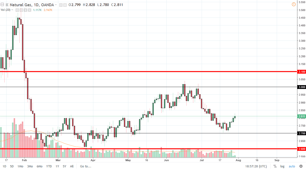 Natural gas markets continue to rally during the day on Monday, breaking above the $2.80 level. The market continues to be very noisy in general, but it also is very consolidated. The $2.70 level underneath is a major support level that extends down to the $2.60 level, while the $3.00 level above is resistive to the $3.10 level. We are in the middle that, but closer to the bottom, which tells me that we will probably continue to see buyers come in on short-term dips, continuing the overall consolidation that we have seen. Natural gas markets of course are going to be noisy as per usual, but right now I think there is more risk to the upside than down. Longer-term I am a bit bearish, but I also recognize that we are at extremely low levels right now.