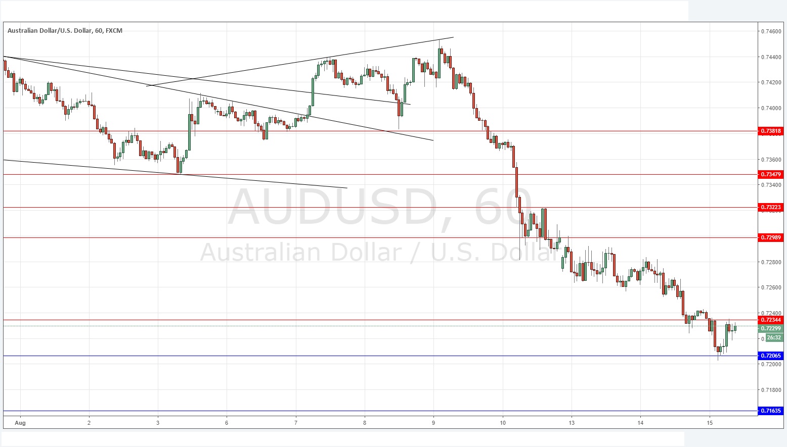 I wrote yesterday that I had a weakly bearish bias, forecasting that the price would continue to fall to at least 0.7230. This turned out to be a good call, and the price eventually fell even further, before making a bullish bounce at the support level of 0.7207. It is trying to rise but facing resistance at 0.7234.