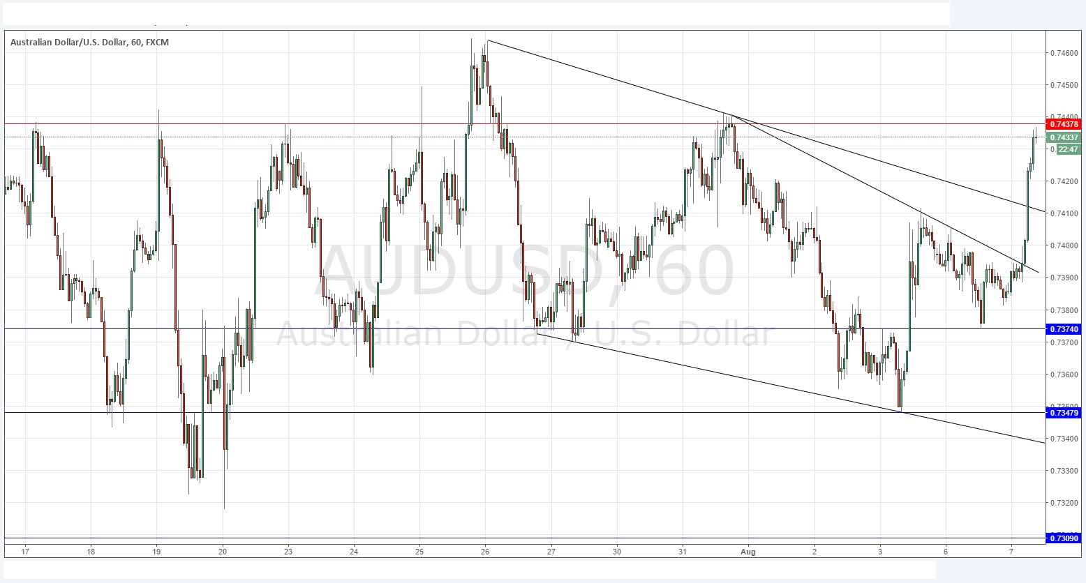 Yesterday I took a cautiously bullish bias above 0.7386. This did not work out very well but with only limited damage, as the price got below that level quite quickly. There has been a high-impact event which has changed the picture on this pair to some extent: the RBA’s monthly input this morning had the effect of boosting the Australian Dollar quite strongly, as rates were left on hold at 1.50%. The price rose firmly over several hours, breaking the upper trend line of the former bearish price channel. It now seems as if the bullish movement is running out of steam close to the nearest resistance level of 0.7438. If the price slowly cools off here at this level, it could set up for a nice short trade before if falls back down again, to at least 0.7412, but be careful not too enter too early – the price needs to cool off first. Alternatively, a firm break above 0.7438 would be a very bullish sign.