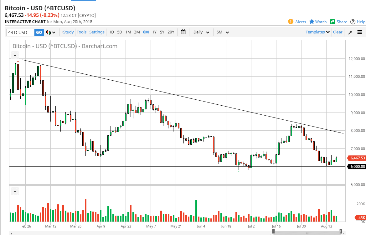 Bitcoin markets were very choppy during the trading session on Monday as traders came back to work from a quiet weekend. Bitcoin continues to struggle to find direction, although I suppose the one thing that you can say about this chart is that the $6000 level very obviously attracts a lot of attention. It is because of this that I believe we will probably see a continued demand for Bitcoin in the short term close to the $6000 handle. If we break down below there significantly, I think that the market breaks down to the $5000 level. I believe at this point the analysis is still going to be the same: sellers will continue to return to this market when we rally from here, as there are several resistance areas just above at the $6500 level, the $7000 level, the $7500 level, and of course the downtrend line that I have marked on the daily chart.