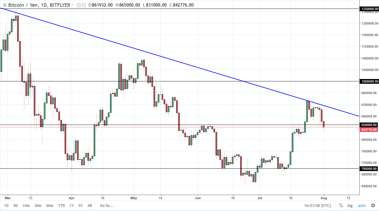 Bitcoin fell again during the trading session against the Japanese yen, slicing through the ¥850 level. There is support down to the ¥800,000 level, so I would wait until we got below there to start shorting again. However, keep in mind that the market breaking down below there will probably send the bitcoin value down to ¥700,000. There is significant support in that area, but I think if we revisit the low it’s only a matter time before we break down rather significantly. In general, it’s likely that we will continue to see this market struggle, especially if the softening Japanese yen can even give it a bit of a boost. Right now, bitcoin looks as if it is going to revisit the lows against most currencies, not just these two.