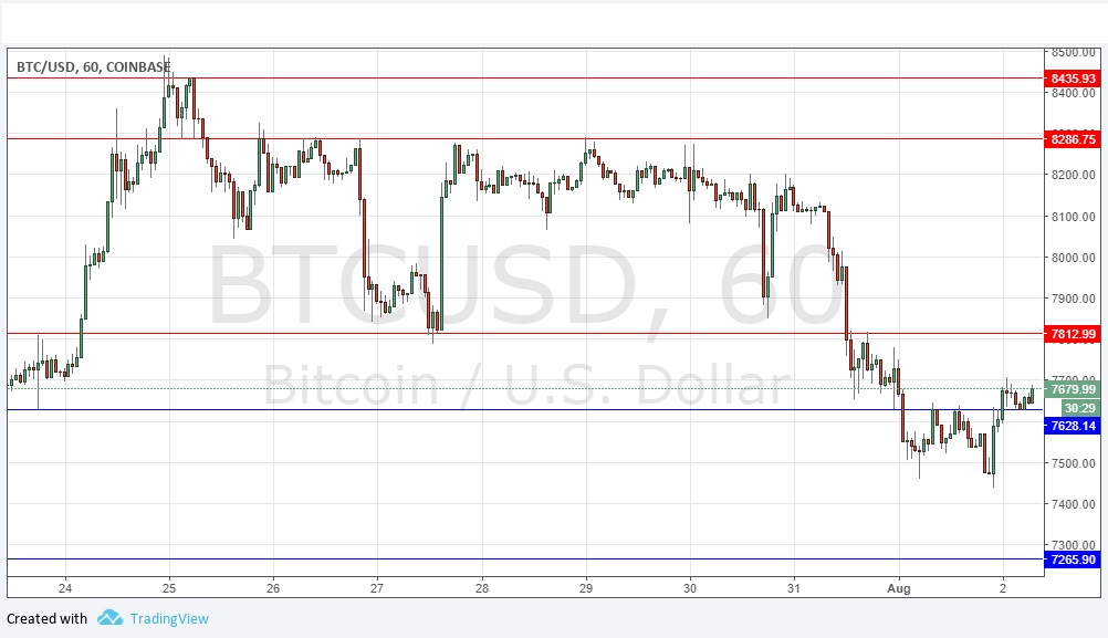 I wrote yesterday that I was very cautiously bearish below $7,632. The price did fall for several hours once it broke below that level, giving a chance for a profitable short trade, but unfortunately the price turned around sharply and now seems to be using this level as support. So, we are short-term bullish, medium-term bearish, and long-term nowhere with Bitcoin, which does not fill me with much confidence in trying to trade this today. The best I can say is that the level at $7,813 which is now resistance looks very strong and pivotal, so a short trade from a bearish reversal seems to be the most likely good opportunity to watch for today. If the price can get established above that level, it would be a bullish sign and I would take a bullish bias.