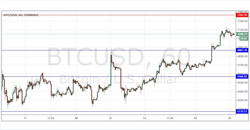 After flattening out, Bitcoin has been rising for some days, so there is a good reason to be bullish. However, the short-term action at $7,100 suggests that the price may be making a minor top and getting ready for a deeper retracement. I would therefore want to see the price break the high before being bullish today, or alternatively a pull back and strong bullish bounce at the support level of $6,867.
