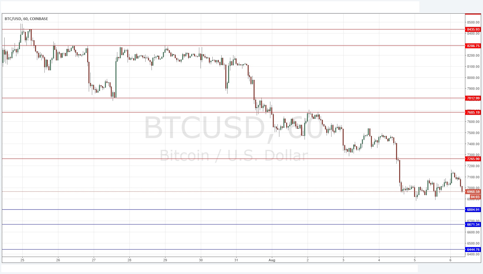 I wrote last Thursday that the level at $7,813 which was now resistance looked very strong and pivotal, so a short trade from a bearish reversal seems to be the most likely good opportunity to watch for today. If the price could get established above that level, it would be a bullish sign and I would take a bullish bias. The price never reached that level, and the price has fallen steadily. We see short and medium-term bearish trends, and if we zoom out, an argument can be made that Bitcoin is still in a long-term downwards trend as well. I take a bearish bias today between $7,150 and $6,805.