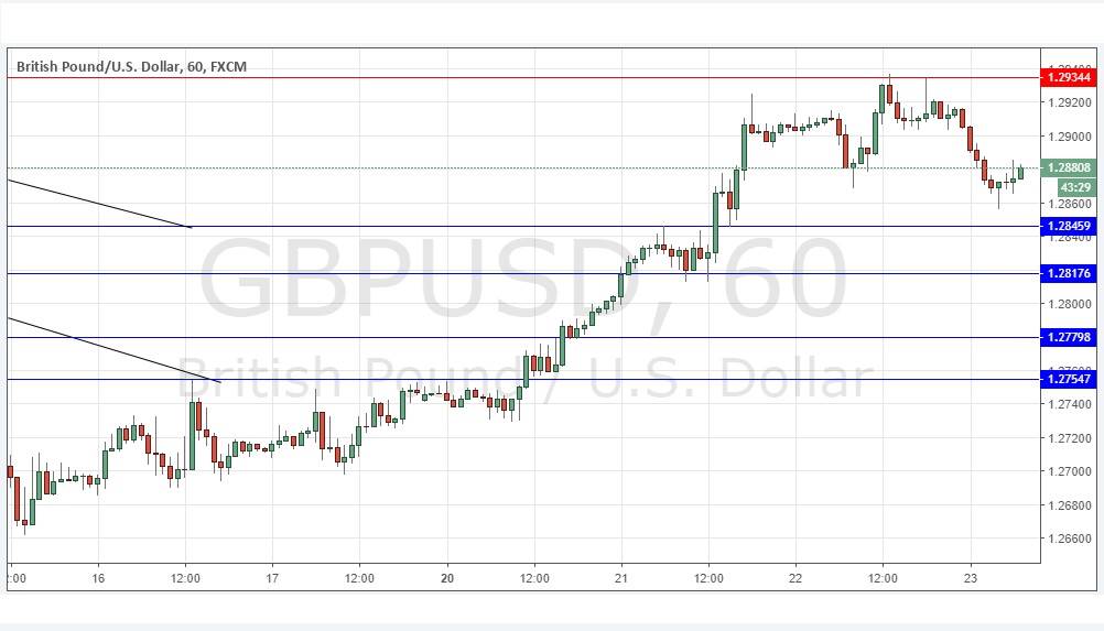 I wrote yesterday that I would have a bullish bias if the price could get established above 1.2920 after London opened. The price did briefly get above that level, but pulled back quite quickly, so it wasn’t a great call but not far wrong. There is new, higher support at 1.2846 and the price may have already found a bottom there after a reasonably deep bearish retracement. We see some mild short-term bullishness, but the absence of any major news today plus the wide zone the price is in suggests that the price is quite likely to trade sideways today and remain below 1.2934 despite the medium-term bullish picture.