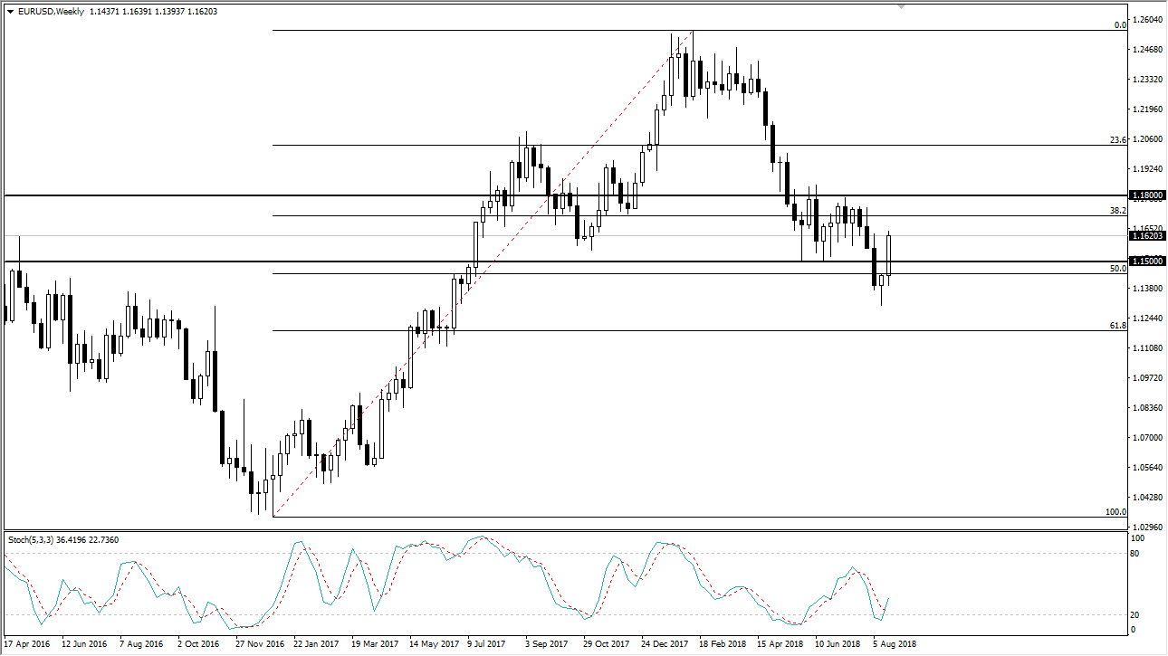 The Euro rallied significantly during the week, reaching towards the 1.16 level rather stringently. We are now starting to deal with a bit of short-term resistance, but I think at this point short-term pullbacks will be buying opportunities as a market has reentered the previous consolidation area. If that’s the case, I anticipate that this market will make a move towards the 1.18 level, over the next several weeks. I remain cautiously optimistic due to the bounce from the 50% Fibonacci retracement level.