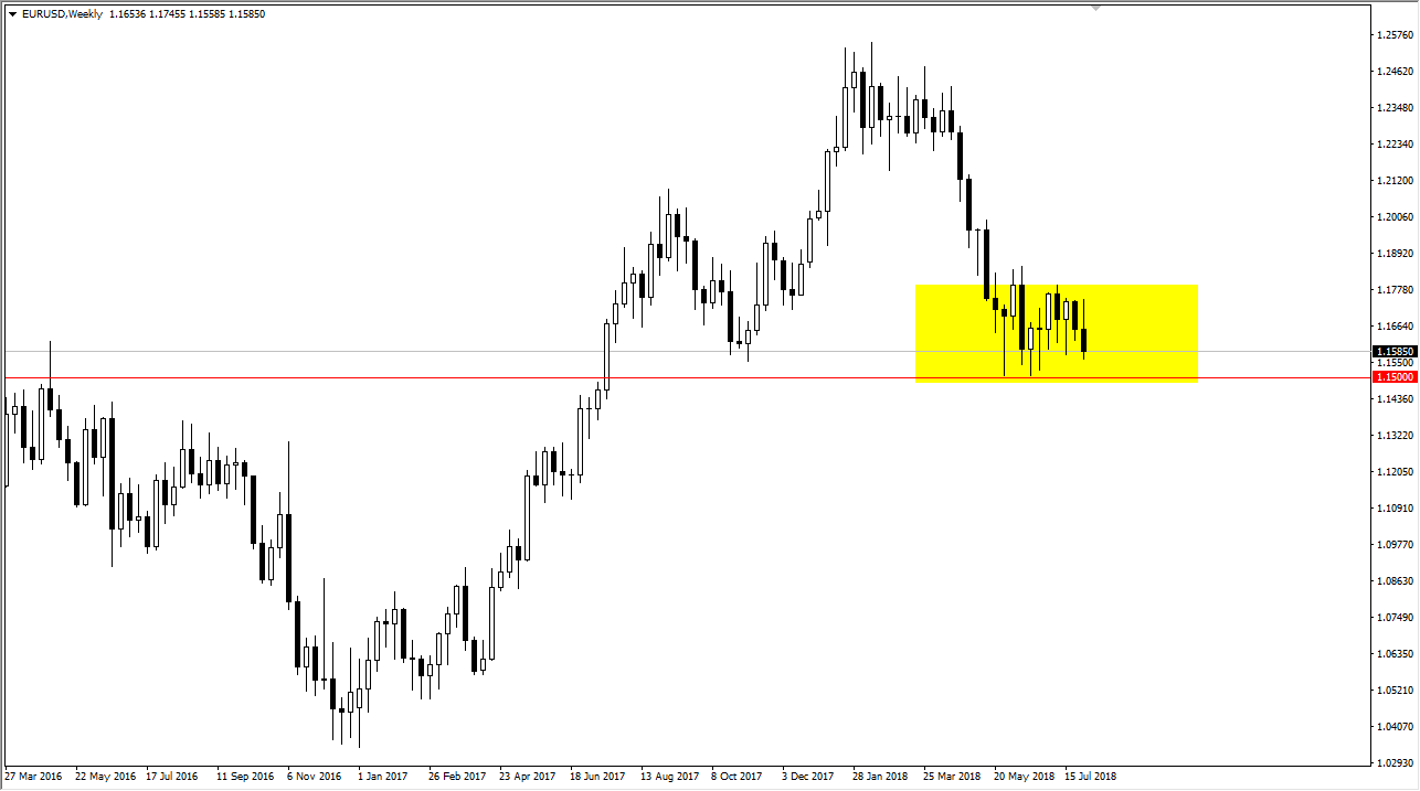 The Euro continues to trade in a fairly tight range, as the market seems to have a lot of supply at the 1.1850 level, while there is a lot of support at the 1.15 level underneath. The market will probably struggle to break out of the range as we are heading into the quiet vacation month of August. The volumes will be a bit low, but then again – there are always potential headlines out there to push things around. I think that we will see back and forth action in the short-term.