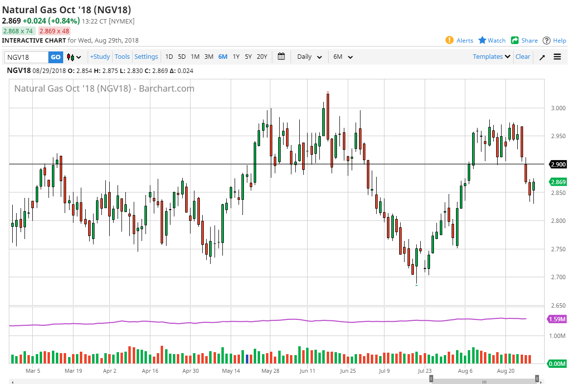 Natural gas markets initially fell during the trading session on Wednesday, breaking through the $2.85 level, and then testing the $2.83 level. We have turned around of form a hammer, which of course is a very bullish sign, and quite frankly I welcome it. A bounce from here should send this market looking towards the $2.90 level, an area where I think there should be a lot of selling pressure. Some type of exhausted candle near that level is exactly what I’m looking for to start selling. The alternate scenario of course is that we break down below the bottom of the range for the day on Wednesday, which would also be a selling opportunity. I have no interest in buying natural gas at this point, and I like the idea of selling rallies going forward. I believe that retesting the $2.90 level is about as good as the buyers will get now.