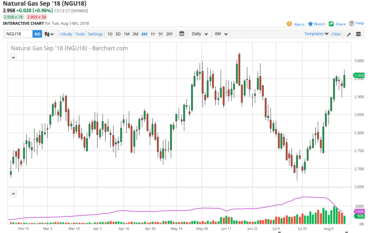 Natural gas markets had a strong session during the day on Tuesday, but as we have seen in the past, once you get above the $2.96 level, things get a bit dicey. I believe that there is a massive amount of supply at the $3.00 level, and it’s likely that traders will continue to be cautious in this general vicinity. Beyond that, the market is certainly a bit parabolic at this point, so a pullback would make sense regardless. With that in mind, I like the idea of selling an exhaustive daily candle, but we don’t have it yet. This would be especially true near the $3.00 level, and I will be watching this intraday for signs of rolling over. The alternate scenario is that we turn around and break down below the couple of hammers and slice below the $2.90 level, which is also a selling opportunity.