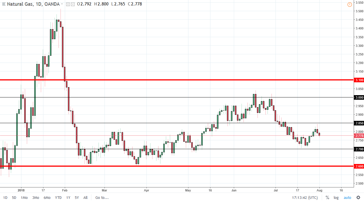 Natural gas markets fell during the trading session on Wednesday, as the $2.75 level underneath has offered resistance, and should now offer support. I believe that the $2.70 level also offer support. The $2.85 level has offered a bit of resistance recently, just as it has been supportive. That is the midline for the larger consolidation area, so I think at this point the best thing you can do is probably look for buying opportunities on softness, giving us an opportunity to pick up natural gas “on the cheap.” If we break above the $2.85 level, then the market probably goes looking towards the $3.00 level after that. Longer-term, I prefer to buy down at the bottom of the range, and sell at the top of the range, which of course is closer to the $3.00 level.