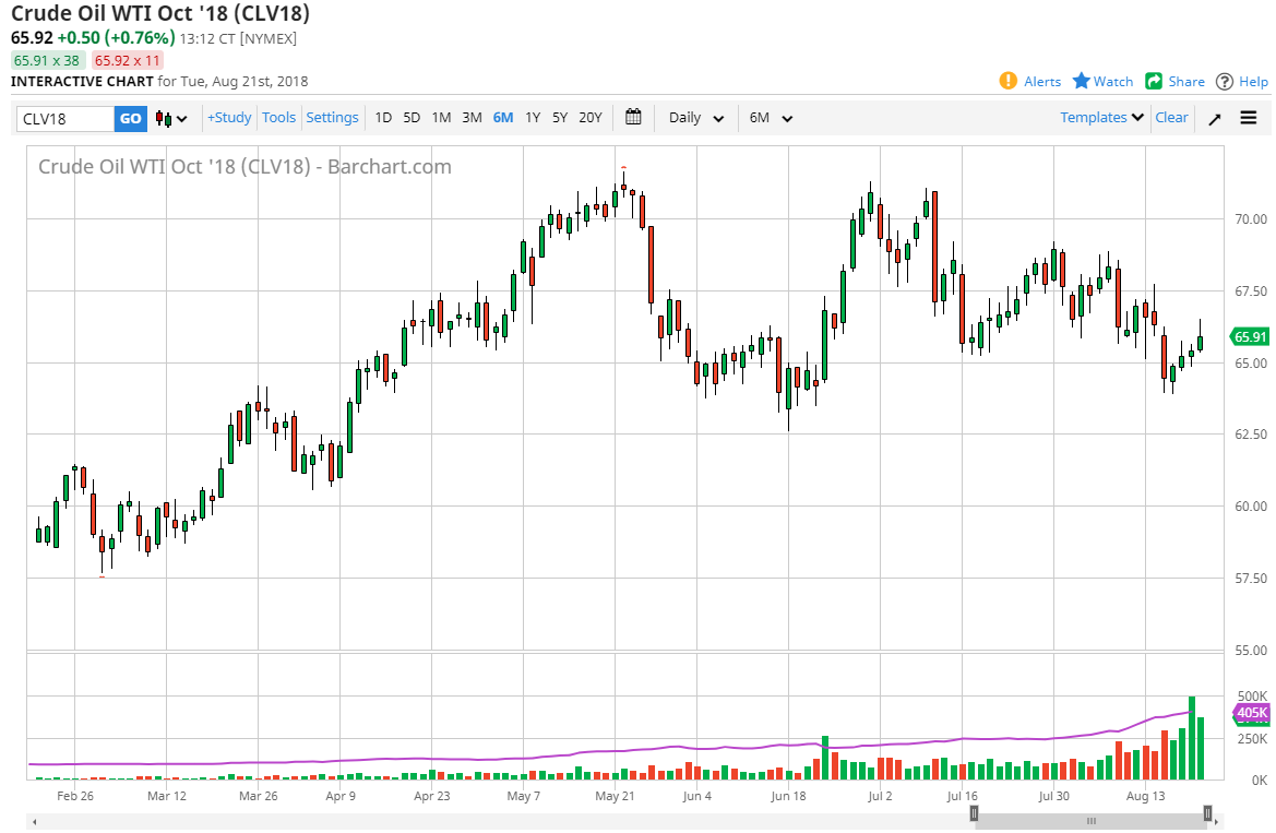 The WTI Crude Oil market rallied rather significantly during the day on Wednesday, reaching above the $66 level. However, we gave back quite a bit of the gains, and by doing so it looks as if we are going to finish below that level now. This is a market that continues to go back and forth, but obviously the falling US dollar during the day helped. I think that overall, the market will probably pull back a little bit here, but if we were to break above the top of the range during the trading session, extensively the $66.50 level, then I think WTI goes looking towards the $67.50 level. It will be influenced by the value of the US dollar, and of course various economic signals and trade war statements over the next several days. The one thing you can probably count on is a lot of volatility.