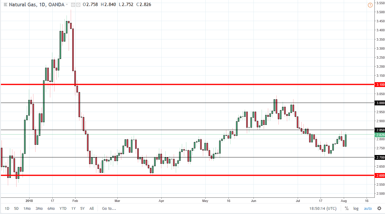 Natural gas markets rallied significantly during the trading session on Thursday, reaching towards the $2.85 level. That’s an area that looks rather resistive for short-term trading, but longer-term it is simply the middle of the overall consolidation range that the market has been in. I think that we will probably rake above $2.85, eventually try to reach towards the $3.00 level. I expect a lot of sellers in that area though, so this is a short-term opportunity at best. I believe selling at that higher level makes a lot of sense, just as I believe that buying near the $2.70 level makes sense as well. I think we stay in this range, and with the jobs number today we could get a bit of volatility but at the end of the day I think we will continue to look at this as a market that is still stuck in overall consolidation.