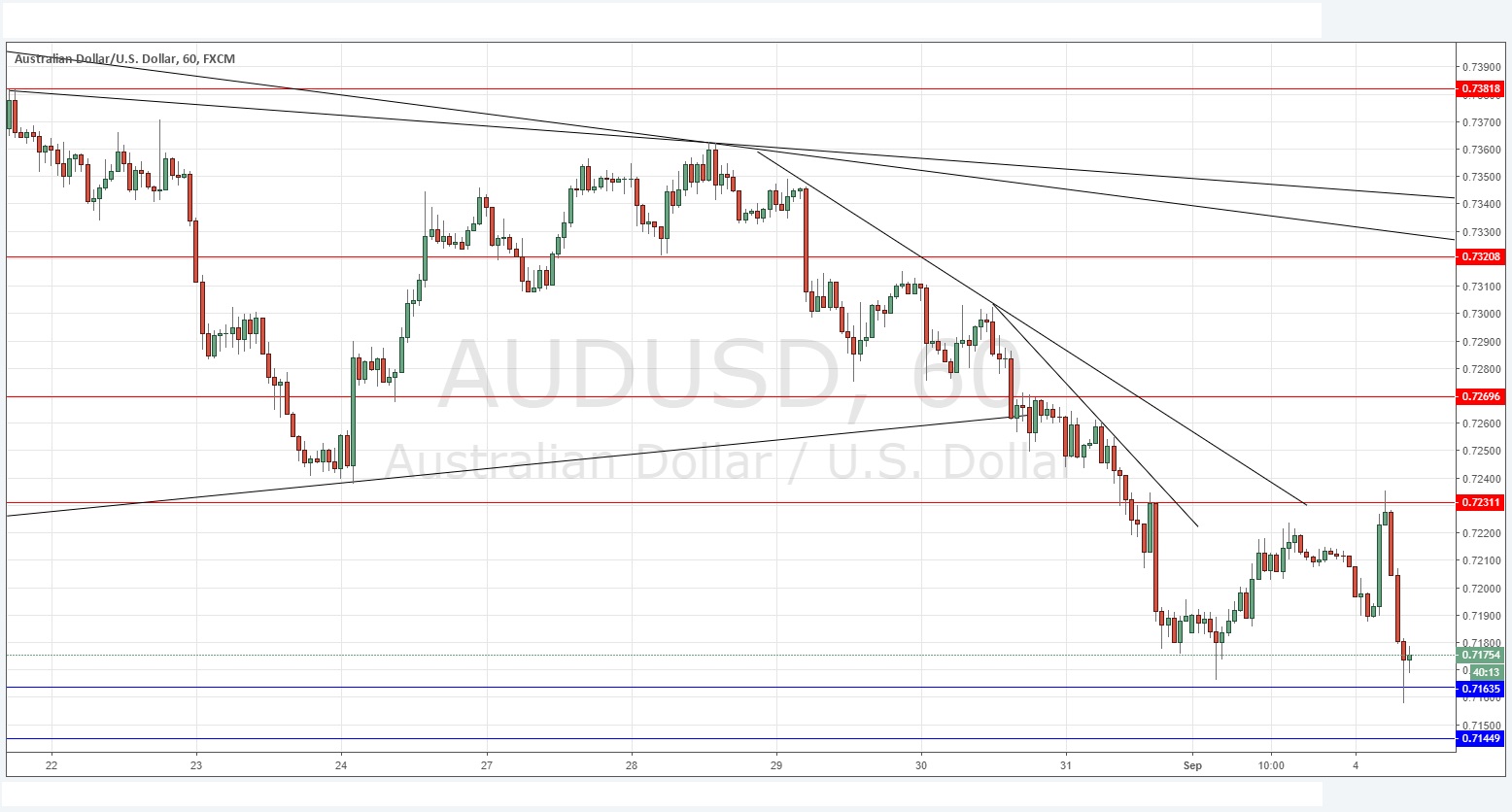 I wrote yesterday that 0.7231 looked like attractive resistance, so a short trade there could be very interesting later due to confluence with the bearish trend line shown in yesterday’s price chart. This turned out to be an excellent call, as this trade set up and has already give a nice profit. There was initially a spike up caused by the RBA Rate Statement released a few hours ago, but it was unable to convince the market which has made the Australian Dollar very weak over the long-term.
