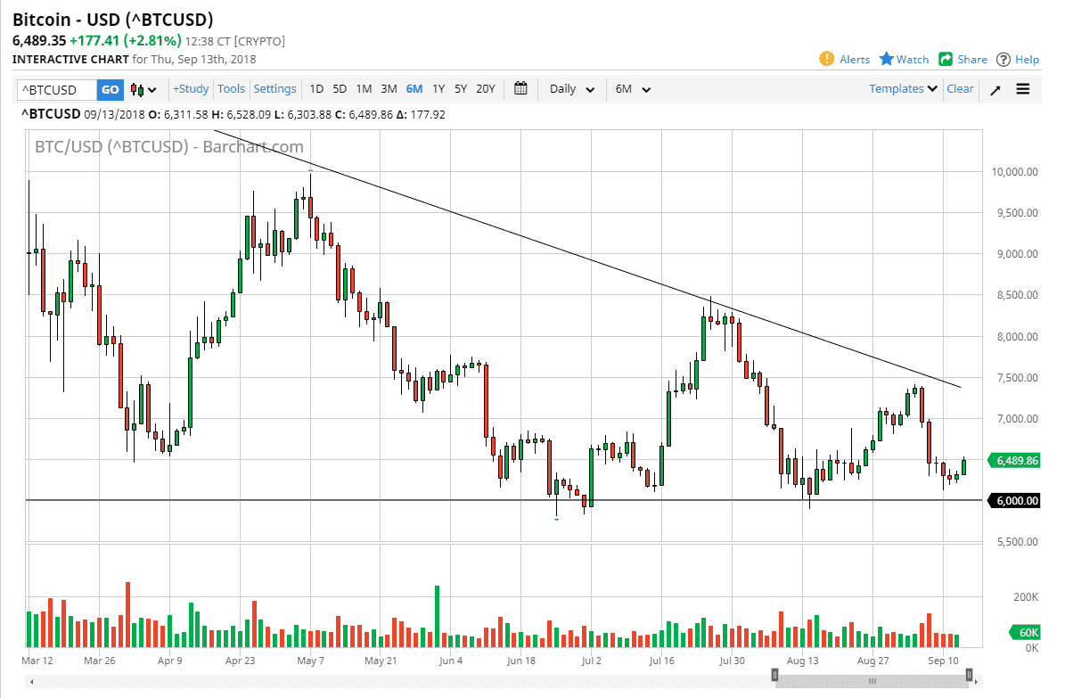 Bitcoin rallied a bit during trading on Thursday as we continue to see support just around the $6000 level. However, one thing that this market does not have his volume right now, so I don’t put much stock into these bounces. I think this just simply shows that somebody is serious about protecting the $6000 level, something that we already knew. I believe that after this bounce occurs, there will probably be sellers jumping into the market near the $7000 level. There is the downtrend line to worry about still, so keep that in mind as well. I think that some type of exhaustive candle is yet another reason to start selling. At this point, I don’t know that I’d even wait for a daily candle, I’d probably wait for an hourly or even a four hour candle to do so.