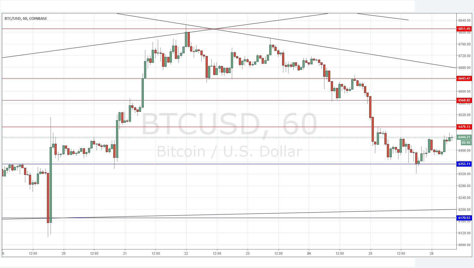 The technical picture has not changed much, I have just moved the nearest support don a little to $6,353 and drawn new lower resistance at $6,479. The short-term direction looks weakly bullish but over the medium-term, it is impossible to make a good call here. I think the most exciting levels are far away: the support at $6,171 and the resistance at $6,643.