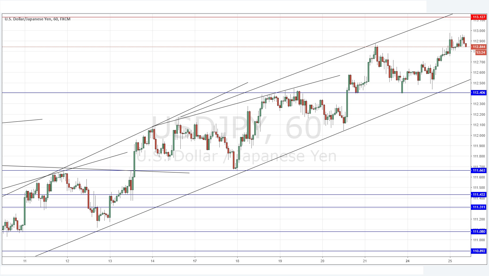 I wrote last Thursday that I would have a bearish bias if the price broke convincingly below the lower trend line of the channel shown in the price chart below. A strong bearish reversal off 112.57 should also be a great short trade entry if it happened due to the confluence there of a trend line, resistance level, and the psychological importance of 112.50.