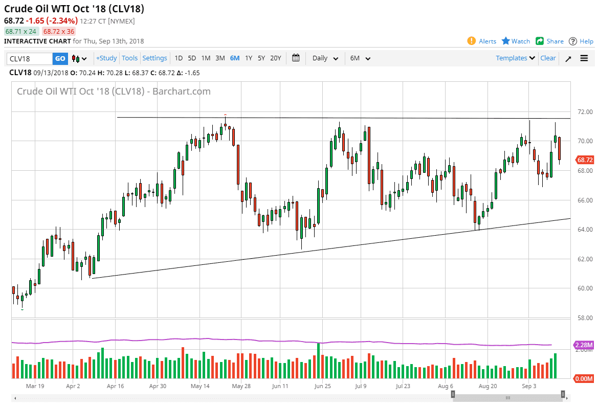 The WTI Crude Oil market broke down on Thursday, breaking the bottom of the shooting star from Wednesday which of course is a very technically bearish signal. However, that doesn’t necessarily mean that the trend is going to change soon, it just simply means that a pullback was somewhat imminent. We have tested the $71.50 region five times now, which makes me realize just how big of a deal it will be to break through there. If we finally do, this market is going to take off like a rocket. However, I also recognize that there is a lot of support underneath so I think it’s only a matter time before the buyers return. Doing market profile studies, you can see that the $68.50 level is a large concentration of institutional volume. Below there, I think the $68 level would be interesting as well. This isn’t to say that we can break down below there, just that there are a lot of buyers underneath.