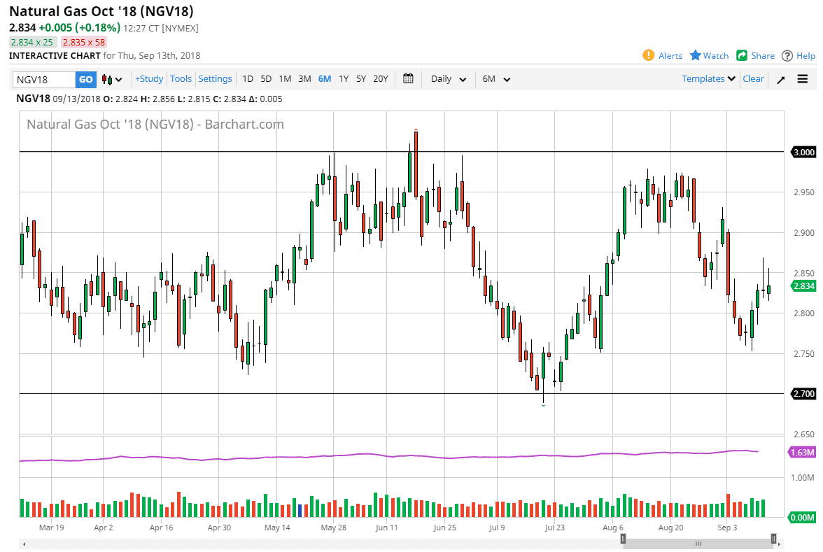 Natural gas markets tried to rally again during the session but also rolled over to form a shooting star. This matches the shooting star from the previous session, so I think we are going to pull back from here. I believe the $2.75 level is the beginning of massive support on the longer-term charts though, so I think this pullback will end up being a buying opportunity eventually. We may need to wait a couple of days to get that proper candle, but I do think that we eventually find buyers jumping in to push back to the upside. We are certainly heading to the right time of year to see bullish pressure in the natural gas markets.