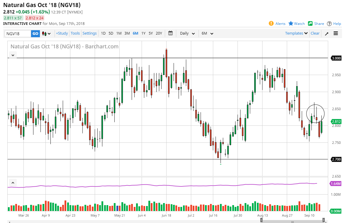 The natural gas markets have rallied quite nicely over the last 24 hours, as we continue to see the $2.75 level offer support, extending down to the $2.70 level. Ultimately, the $2.85 level has caused a lot of resistance as you can see, I have it circled on the chart. However, look at the longer-term charts, it’s obvious that we will probably go to the upside, perhaps reaching towards the $2.95 later on. As we go into the colder months, natural gas market traders typically become buyers and bullish, as demand will certainly be picking up in the northeastern part of the United States, one of the most important natural gas markets in the world. I think we will eventually rally and break above the ellipse that I have on the chart, but we may need to pull back a couple of times to finally build up the necessary momentum.