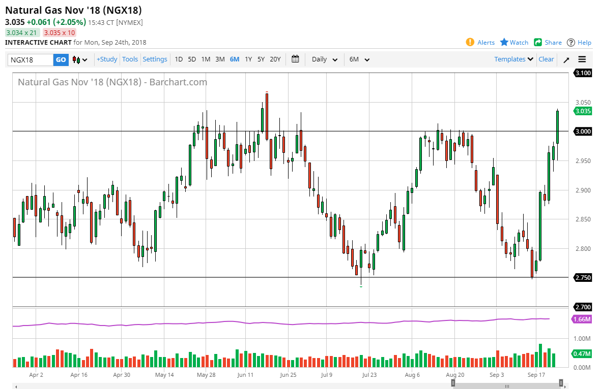 Natural gas markets initially fell towards the $2.95 level during the day on Monday, and then broke above the $3.00 level rather handily. It now looks as if we are going to head to the $3.05 level, but there is a lot of resistance just above and we are without a doubt overbought at this point. I think at this juncture, it’s probably better to find some type of value to buy or sell an exhaustive candle if you get one. I would be very cautious about this market over the next 24 hours and will revisit the charts at the end of the day to see if there are any signals kicking off. We obviously are very bullish, but there is a significant amount of noise just above.