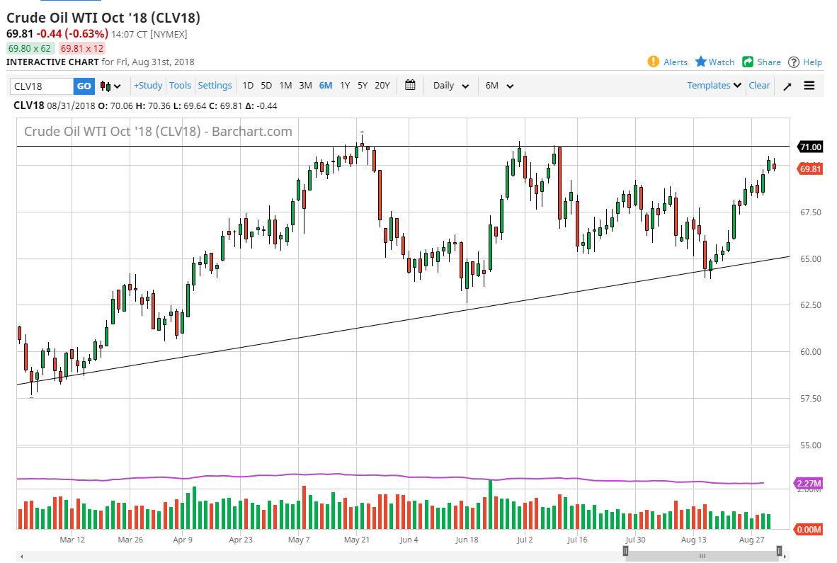 The WTI Crude Oil market tried to rally during the day on Friday, but then turned around to form a bit of a shooting star. Ultimately, the WTI Crude Oil market probably breaks out to the upside but we are still concerned about US/Canadian conversations, and of course the trade war with China. It seems as if it’s likely that the overall attitude of the marketplace will continue to be bullish, but that’s the longer-term sentiment, not something that can withstand this type of bearish attitude and of course negative headlines. Overall, I believe in buying dips, but it may take some time to offer itself. The alternate scenario is of course just simply breaking above the resistance at the $71 level, which would be a very strong play. The US dollar strengthening certainly is not helping the situation either.