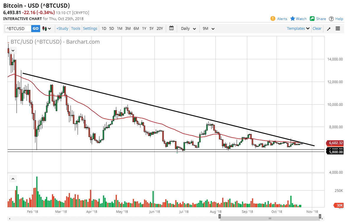 Bitcoin markets continue to do very little during the day, and it looks very likely that we are entering a sideways market. I think that the descending triangle is about to be broken, but unless it’s some type of explosive move in the next couple of days, it simply going to be a failed pattern. Ultimately, if we break above the uptrend line with significant volume, then we can be talking about a move above $7000 in towards the $8250 level. At this point, I suspect that what we are looking at a market that simply has no catalyst for movement. That would jibe well with the idea of the market slicing through the end of the triangle and go sideways but keep an eye on headlines obviously.
