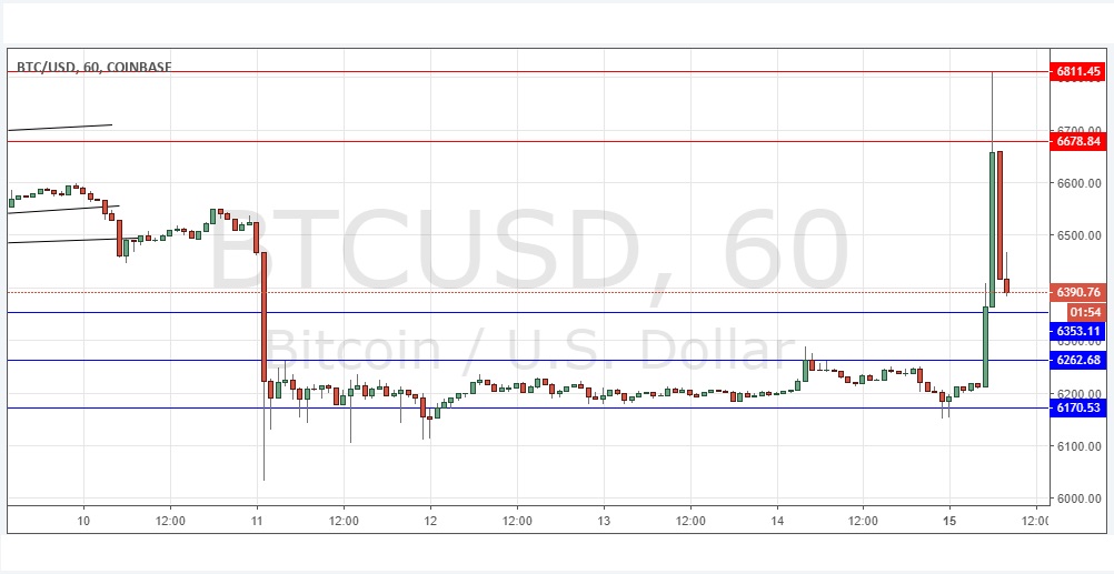 Bitcoin is prone these days to sudden huge spikes which then tail off with no residual volatility. This is strange and after a huge spike like this it is probably best to stay away, although a long trade from a bounce at the new higher support of $6,353 might be interesting.