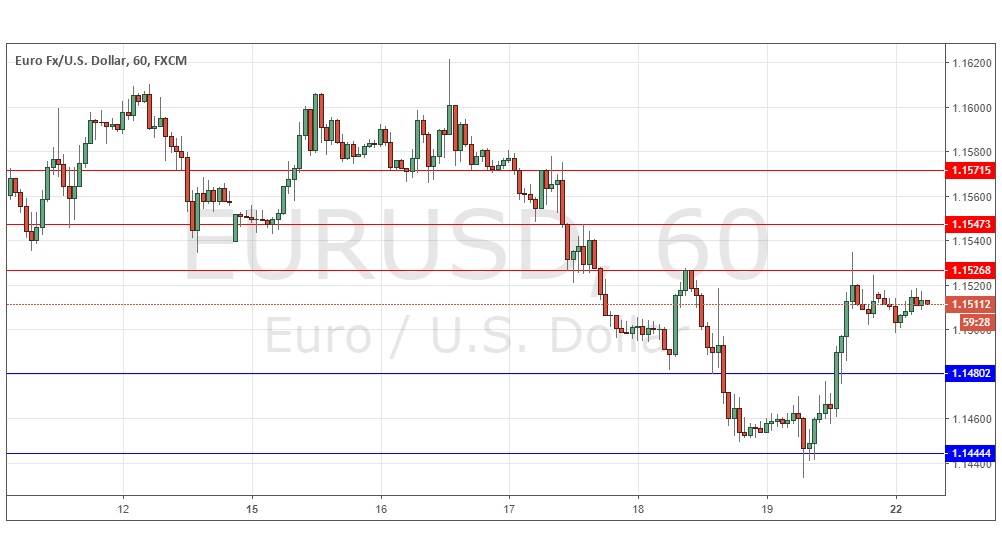 Short entry following a bearish price action reversal on the H1 time frame immediately upon the next touch of 1.1527, 1.1547, or 1.1572.
