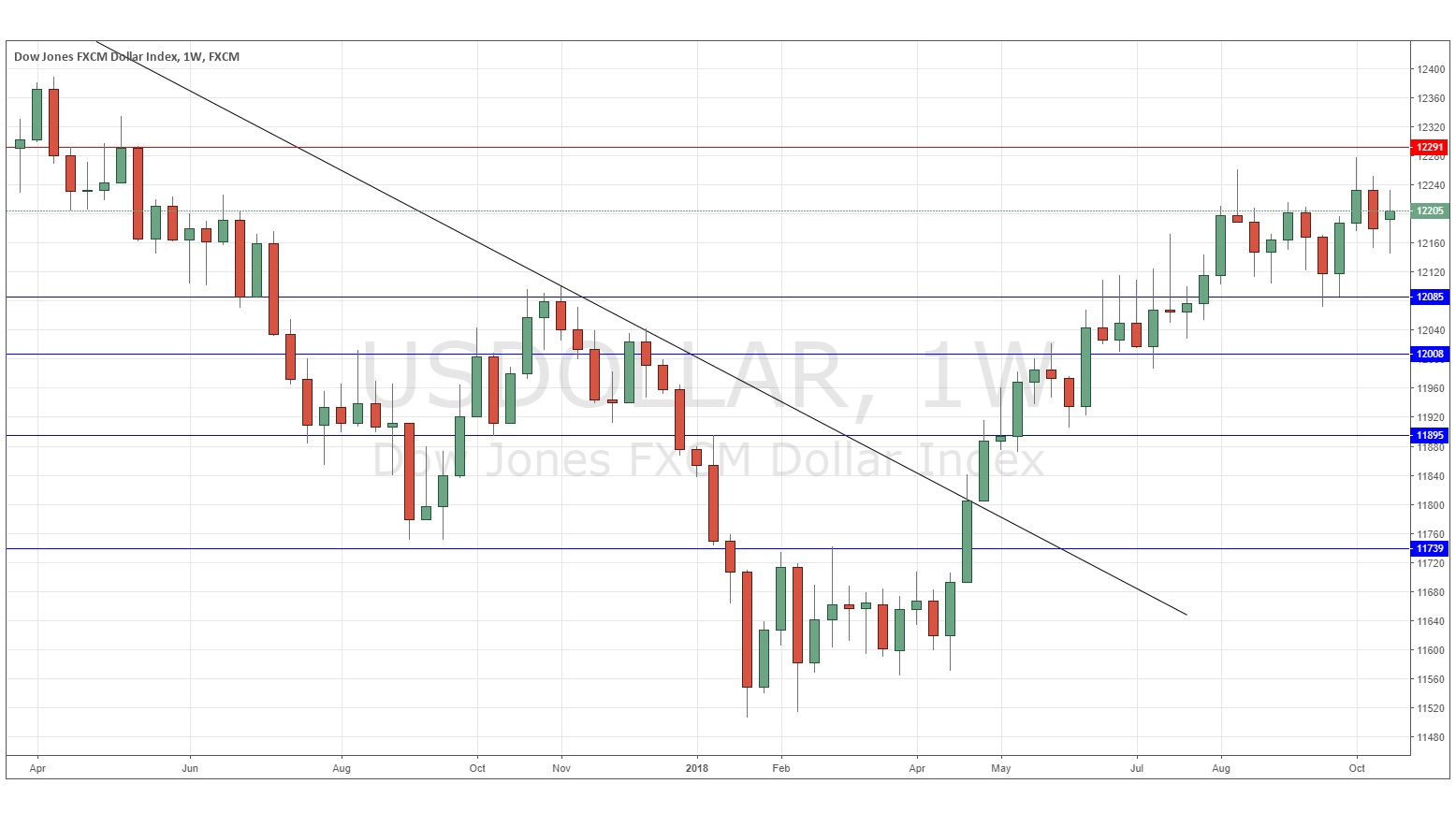 The weekly price chart below shows that after last week’s bearish candlestick, the price remained mostly unchanged over this week, printing an inconclusive doji candlestick, which closed above the support level at 12085. The price remains within a multi-week consolidation between support and resistance and I have no strong confidence as to short-term direction, although the edge is still technically in line with the long-term bullish trend, which remains intact.
