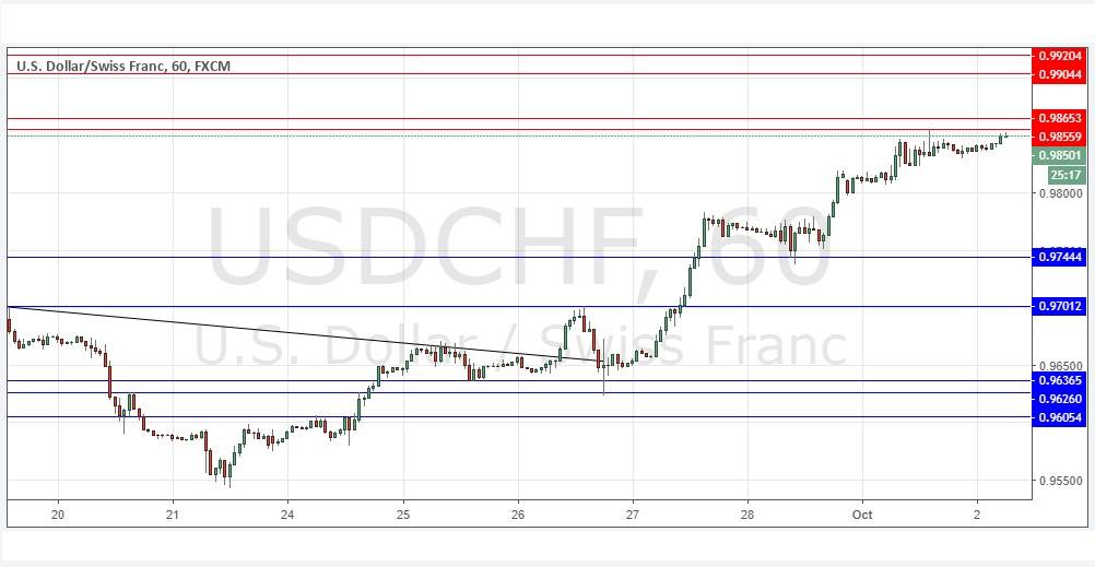 Short entry following a bearish price action reversal upon the next touch of 0.9856, 0.9865, 0.9904, or 0.9920.