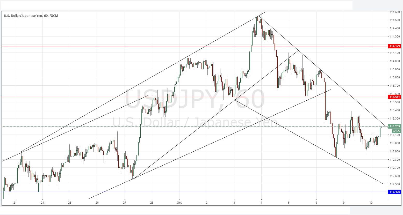 I wrote yesterday that the bearish trend line shown in the price chart below was confluent with a generally resistant area above 113.40 and this area was likely to be pivotal: failures there might have provided nice short trade entries. In a way, this wasn’t a bad call as the price never managed to get above 113.32. The price is rising now after a period of consolidation, and is not far from the bearish trend line, so it may well find it hard to rise much further. I think that much will depend upon the U.S. stock market at the New York open later today. If we see another sell-off which gathers pace, the Japanese Yen is usually a safe-haven destination upon stock sell-offs, so we may be setting up for a downwards movement.