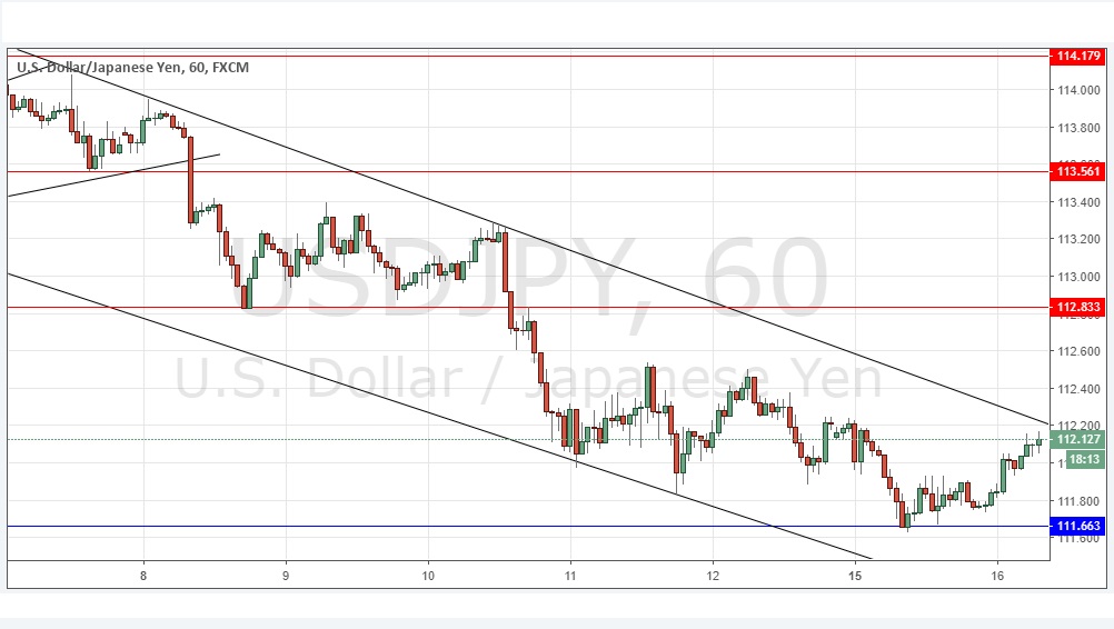 Yesterday’s signals produced a profitable long trade entry following the bullish doji candlestick on the hourly time frame which rejected the support level identified at 111.66. It would probably be a good idea to take profits now as the price has reached the top of the bearish price channel shown in the chart below.