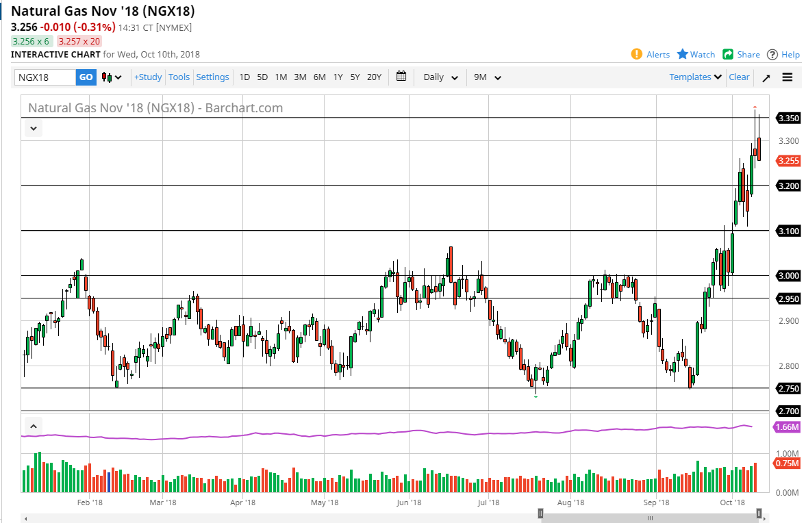 Natural gas markets tried to rally again during the day on Wednesday but turned around to form another shooting star like candle. This is a market that has been a bit overdone as of late, and after the candle stick for the trading session on Wednesday, I have become even more convinced that we will probably see a bearish pressure enter the market for the short term. Granted, we are at the beginning of bullish seasonality, so it’s only a matter time before buyers return. I think in the short term though, it’s very likely that we see a bit of a drop. Overall, I believe that we will probably go looking towards the $3.25 level, possibly the $3.20 level after that. I think short-term opportunities are showing up for or sellers but be very cautious and recognize that it’s only a matter of time before we turn around.